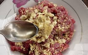 - Gừng thái nhỏ, trộn thịt bò băm với tỏi băm, hành hoa, ½ thìa muối, một chút xíu đường, hạt tiêu và 1 thìa nước mắm.